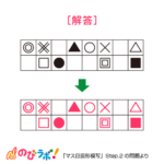 この「マス目図形模写」シリーズよりもレベルが上がってくると、マス目上の位置や移動、記憶、回転などが加わります。このシリーズで、マス目上の位置を正しく読みとれるようにしっかり練習していきましょう。