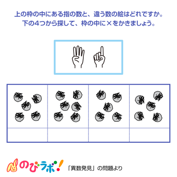[問題]上の枠の中にある指の数と、違う数の絵はどれですか。